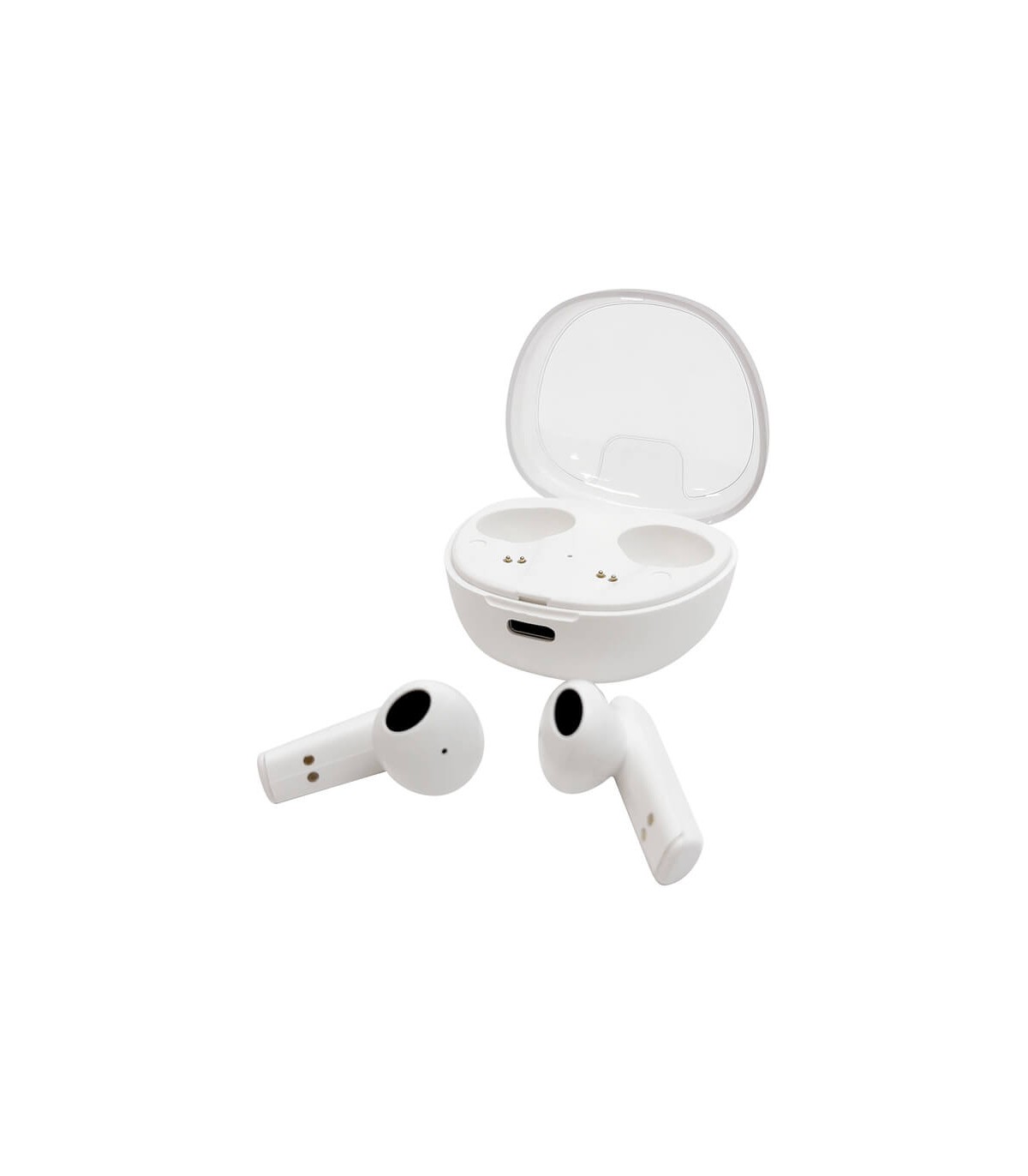 5,5 cm x 5 cm x 2,5 cm. (medida de la caja) 3 cm (auriculares). Plástico ABS. Auriculares bluetooth con imán, se conectan al celular de forma inalámbrica. Función táctil de encendido, apagado, avance, retroceso y pausa. También permite responder, rechazar o finalizar una llamada. Estuche con indicador luminoso que permite cargar la batería de los audifonos. Capacidad de carga: 200 mAh. Capacidad de batería de litio por auricular: 30 mAh. Bluetooth V5.0. Rango de alcance: 10 metros. Tiempo de reproduccion autónomo: 3h aprox. Tiempo de carga de la batería: 2h. Cable de carga USB tipo C. Presentación en caja de regalo.