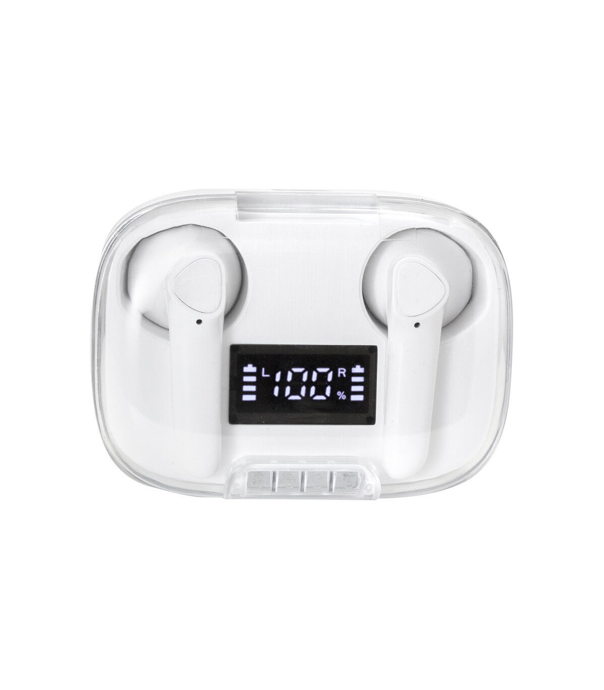 6 x 4,5 x 2,5 mm. Plastico ABS. Auriculares Bluethooth versión 5.0. Capacidad Batería: 30 mAh para cada auricular. Capacidad Batería caja de carga: 300 mAh. Pantalla digital y tapa transparente. Rango de alcance: 15 metros. Tiempo de reproducción: aprox. 3 horas. Tiempo de Carga: 1 hora Duración de la carga en inactividad: 200 horas. Cable de carga USB tipo C en color blanco para auriculares blancos, y en color negro para la versión en negro. Presentación en caja de regalo blanco mate para auriculares blancos y en caja de regalo negro mate para auriculares negros.