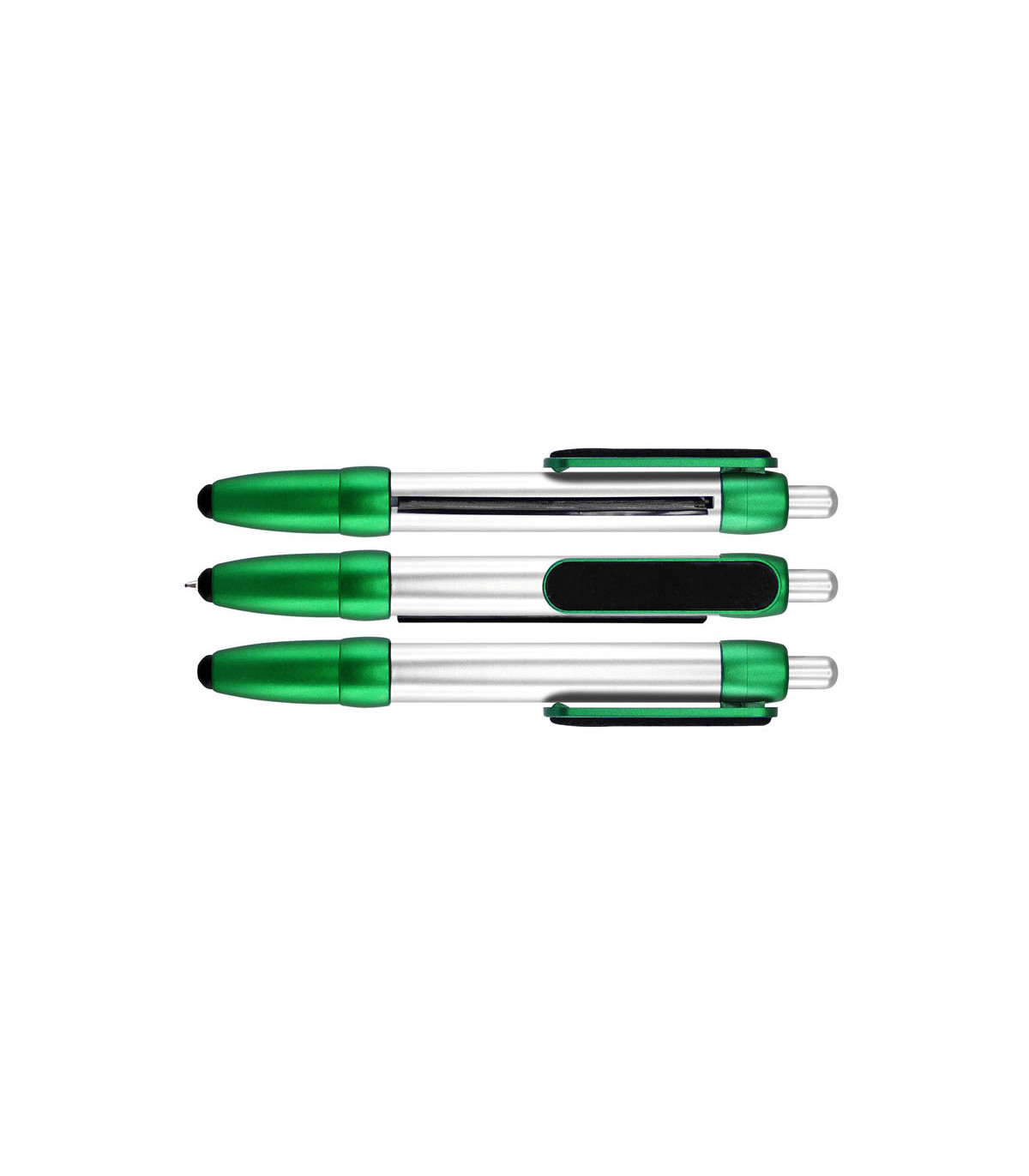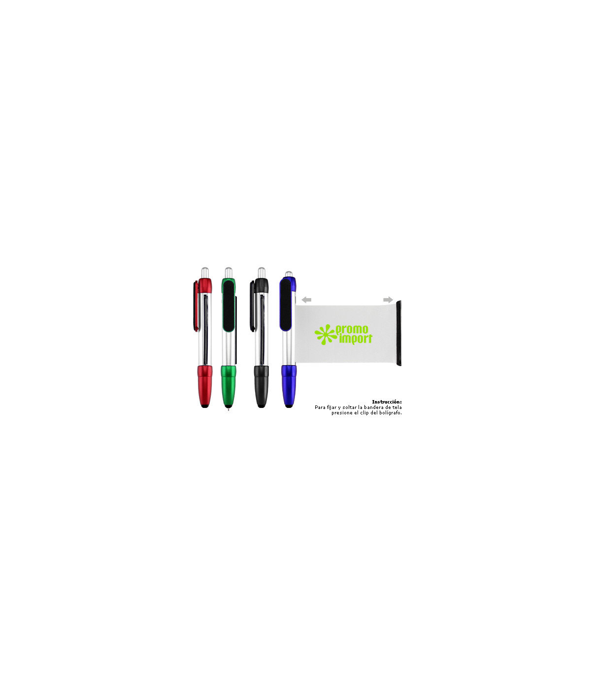 Bolígrafo plástico modelo "Flag", con cuerpo plateado y terminales de color metalizado. Incluye bandera retráctil de tela (para impresión), puntero "Touch-Screen" y clip gamuzado negro para limpiar pantalla táctil. Escritura azul.