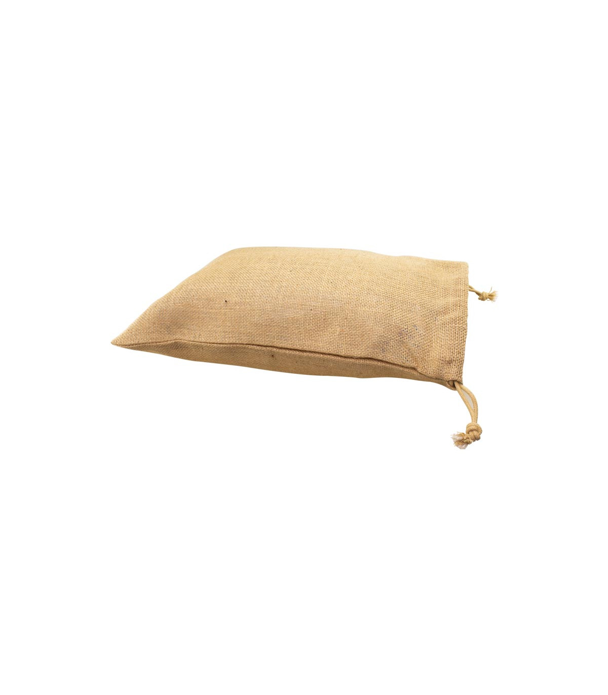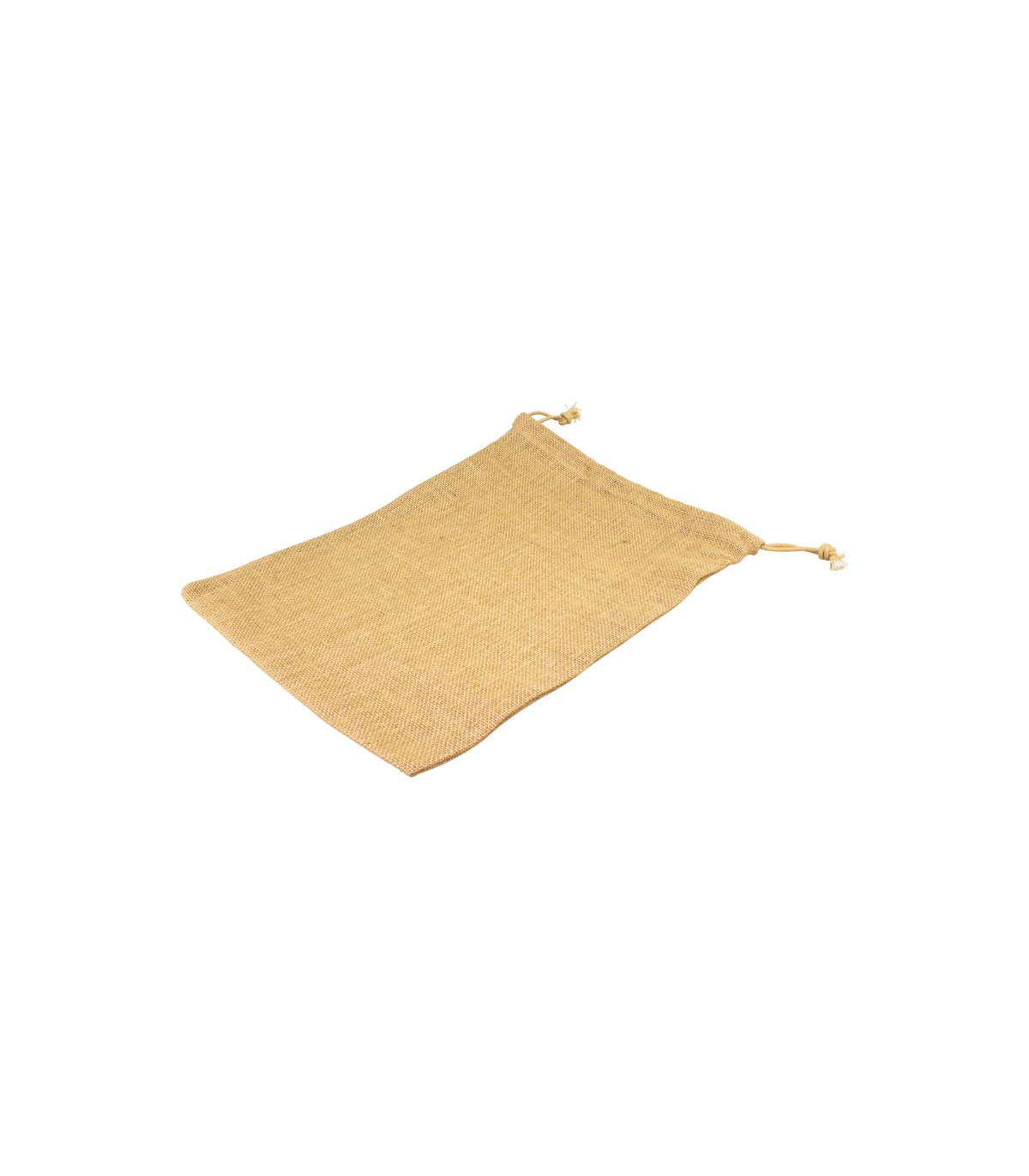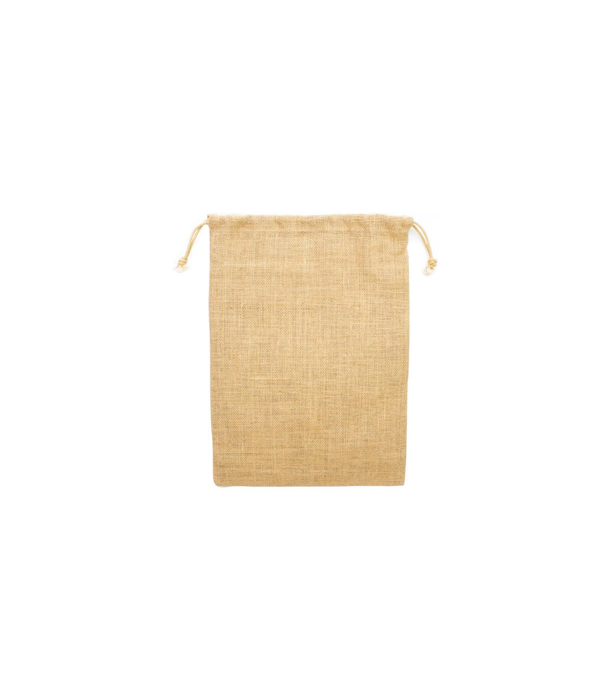 Bolsa de Yute tipo saco de 30 x 40 cm, sin recubrimiento laminado interior. Cuenta con asa-cordón retraíble de yute, en la parte superior de la bolsa.