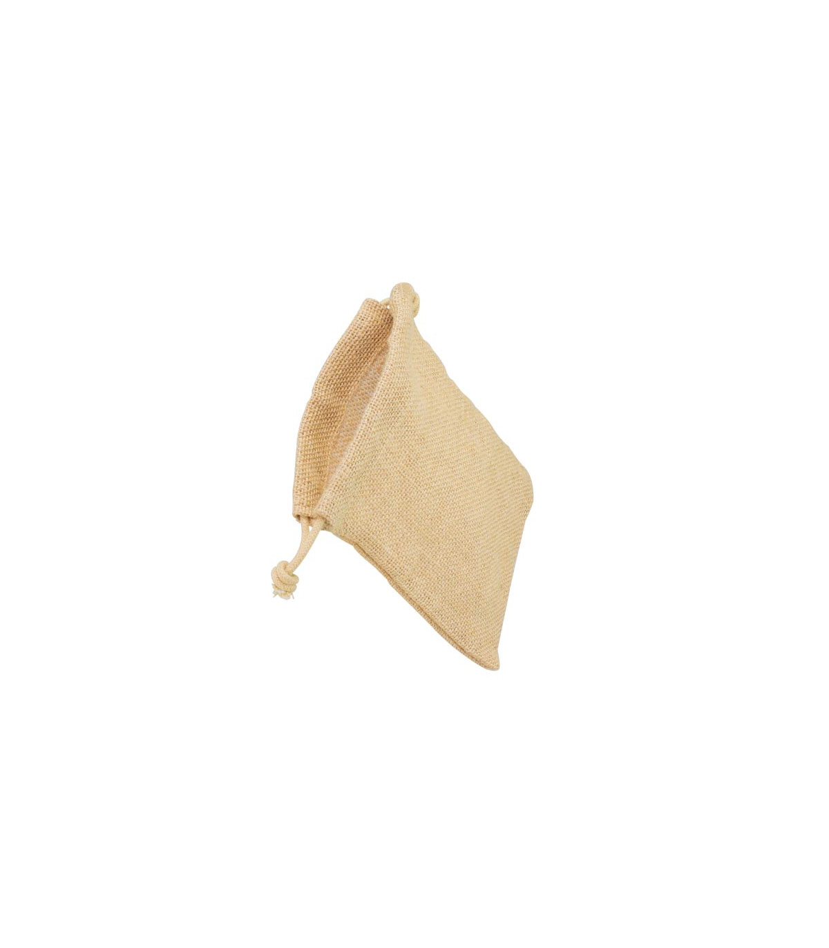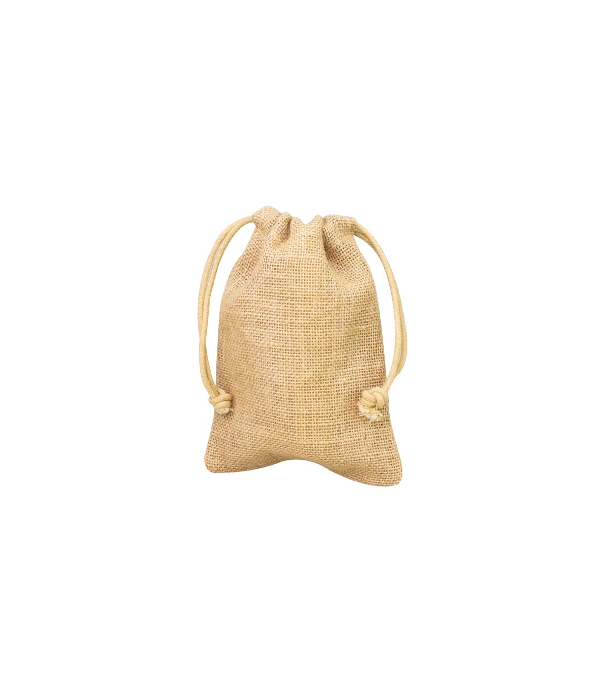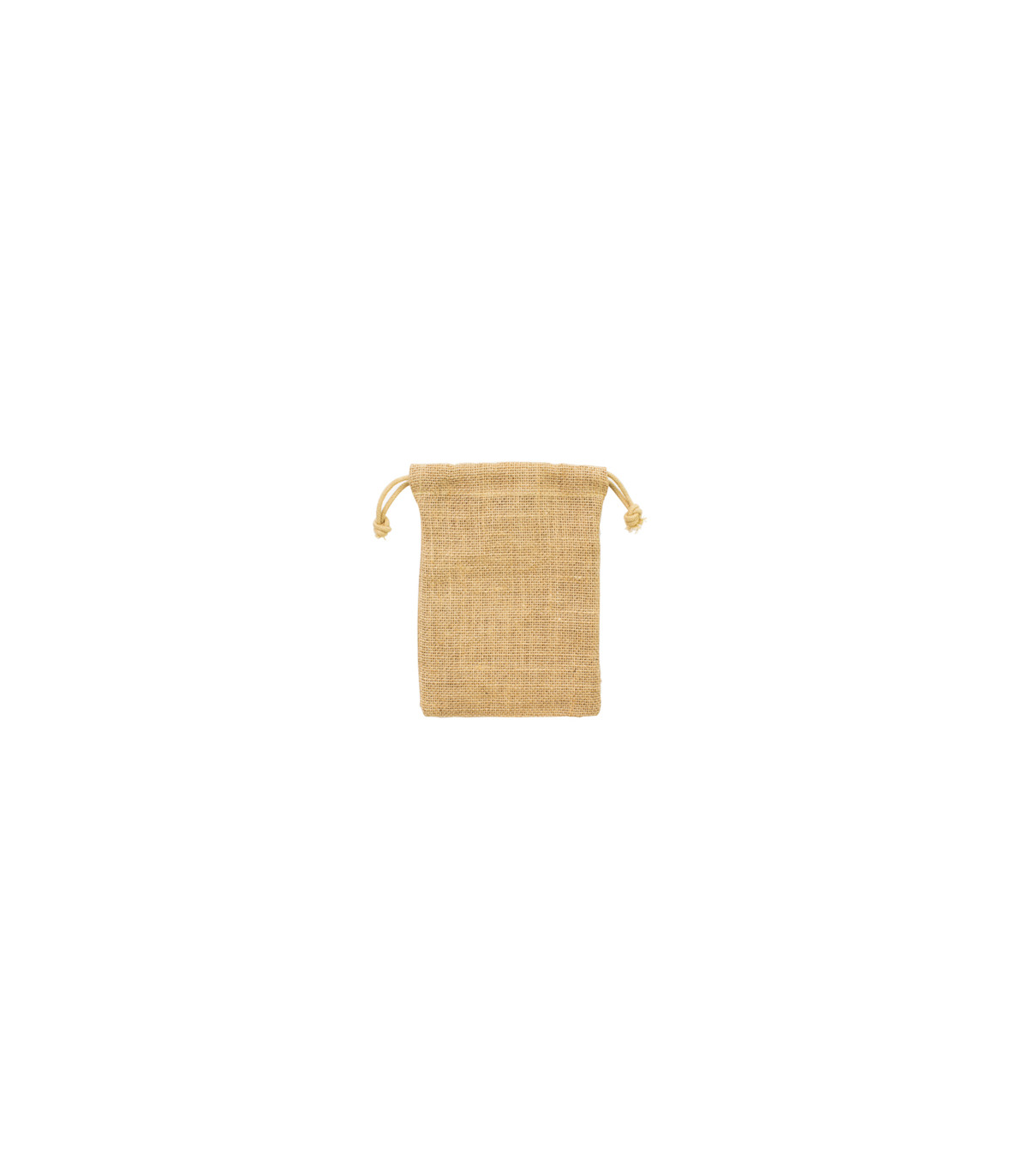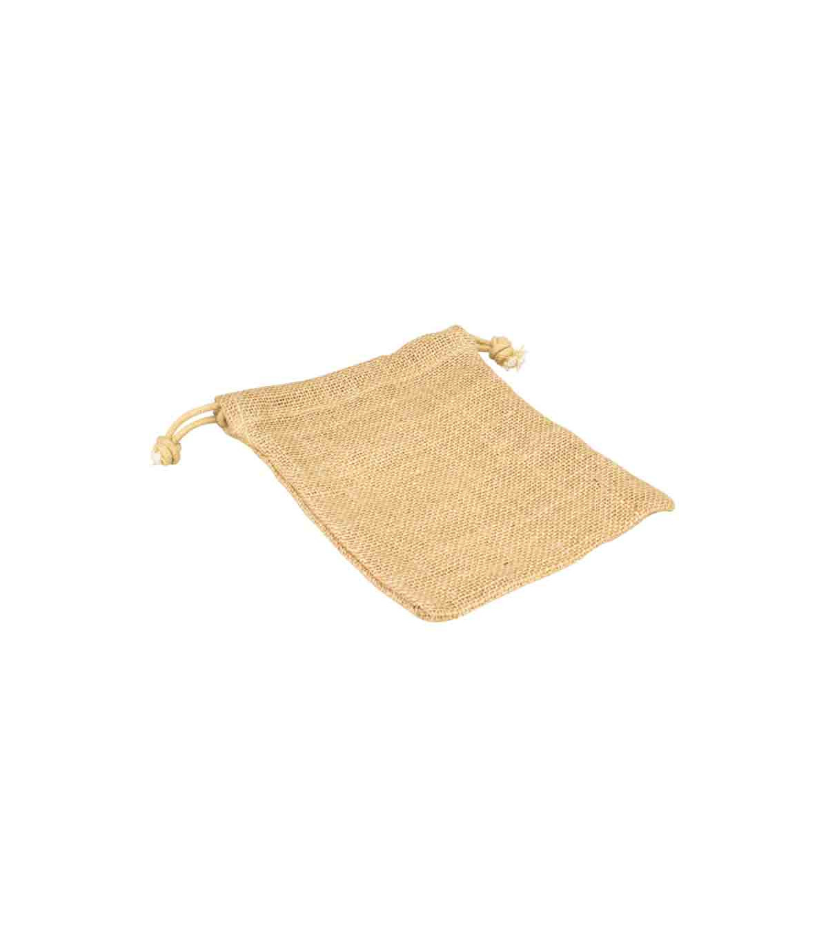 Bolsa de Yute tipo saco de 14 x 19 cm, sin recubrimiento laminado interior. Cuenta con asa-cordón retraíble de yute, en la parte superior de la bolsa.