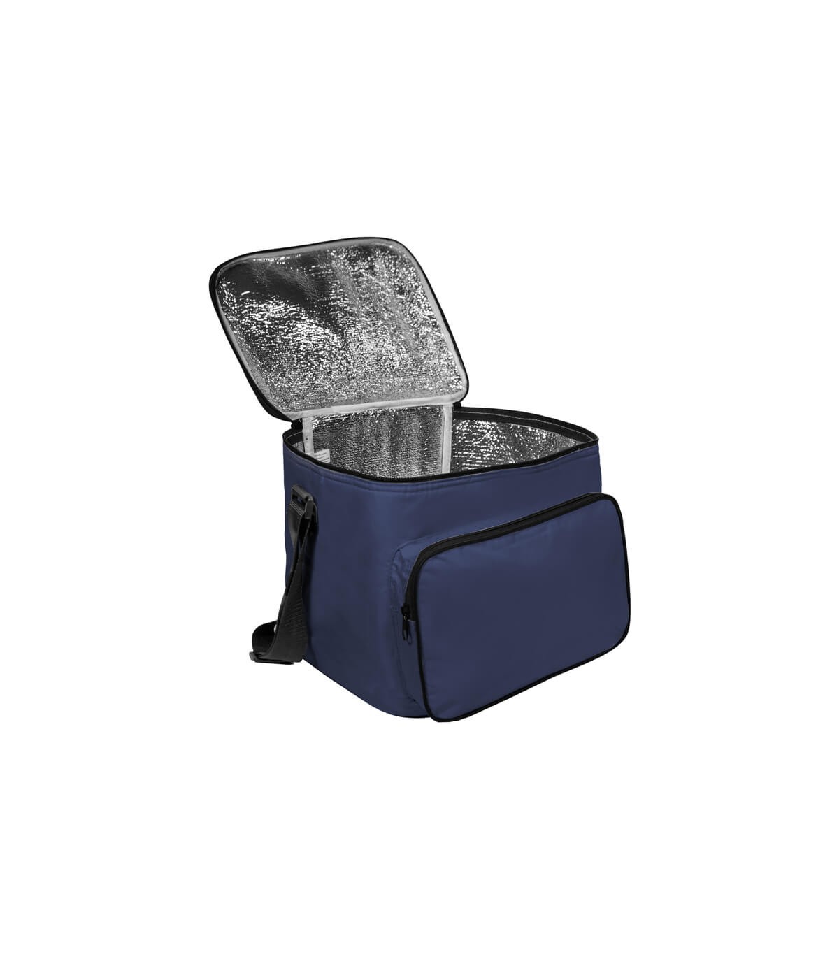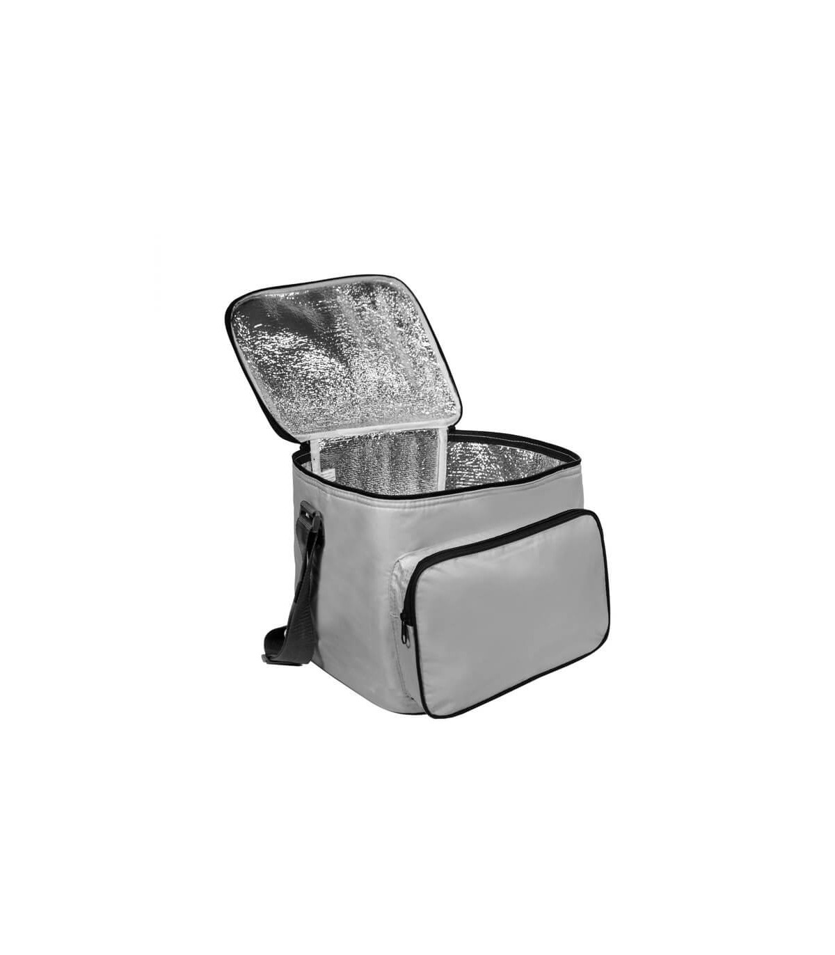 23 x 16 x 26 cm. Polyester 420D. Conservadora con cierre, 2 bolsillos exteriores. Interior con foil de aluminio. Correa regulable.