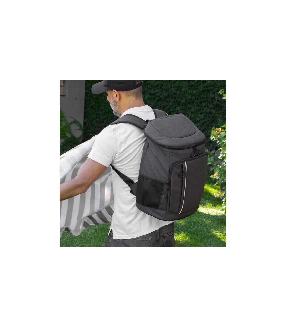 43 x 29 x 18 cm. Capacidad 18 litros aprox. Poliéster Wulong 300D + Interior forrado en PEVA color plata con relleno de espuma de PE. Mochila cooler. Compartimento principal con cierre en la parte superior. Compartimento frontal con cierre, bolsillo interno de red con cierre y bolsillo externo vertical con cierre y banda reflectante. Dos bolsillos laterales de red multipropósito. Incluye abridor de botellas de acero inoxidable (6,3 x 3,3 xm) extraíble. Correas regulables acolchadas. Cierres metálicos. Tiradores de cierre plásticos en forma de U de color negro.