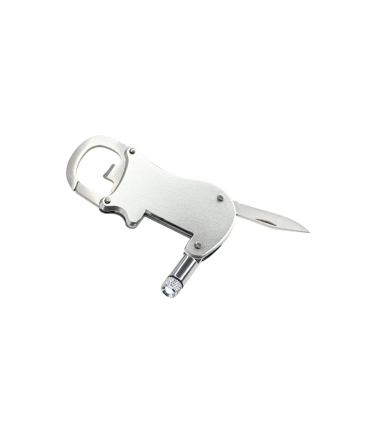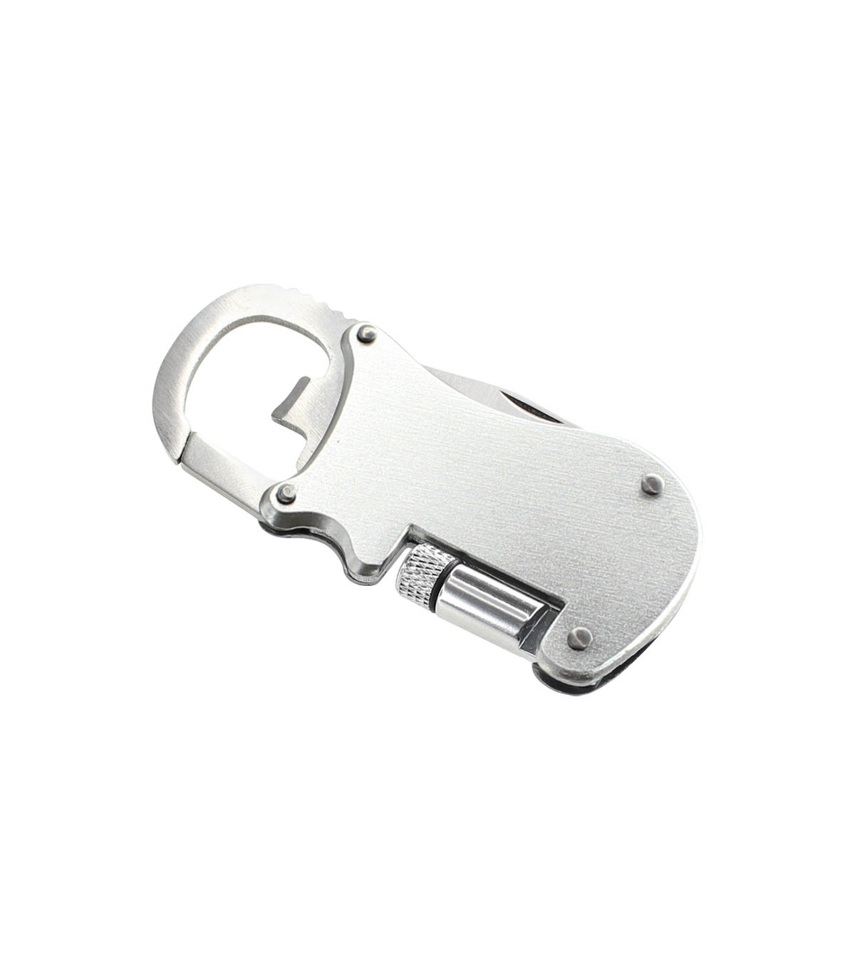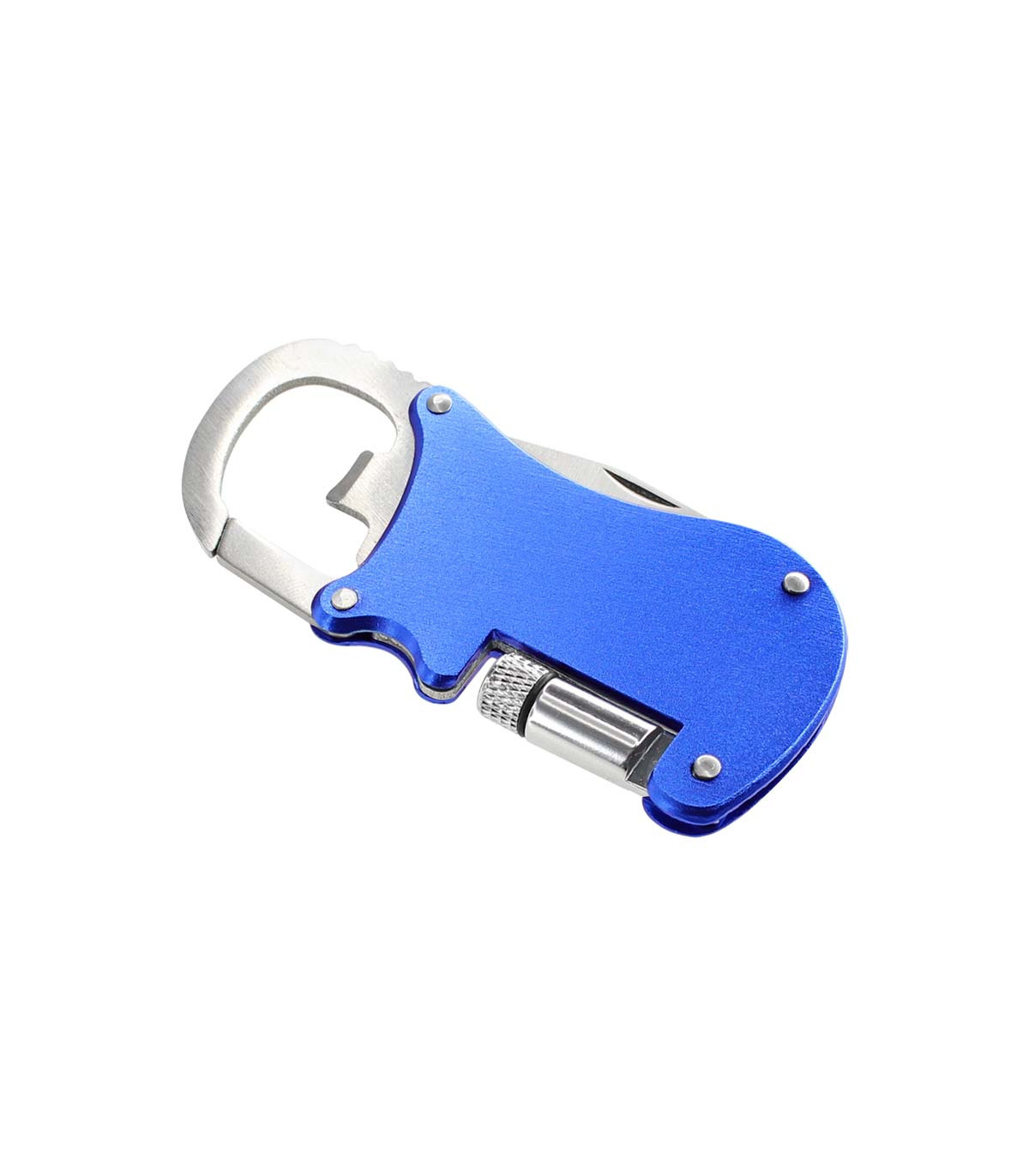 Multiherramienta metálica 4-en-1 con Linterna LED, Navaja, Destapador y Mosquetón.