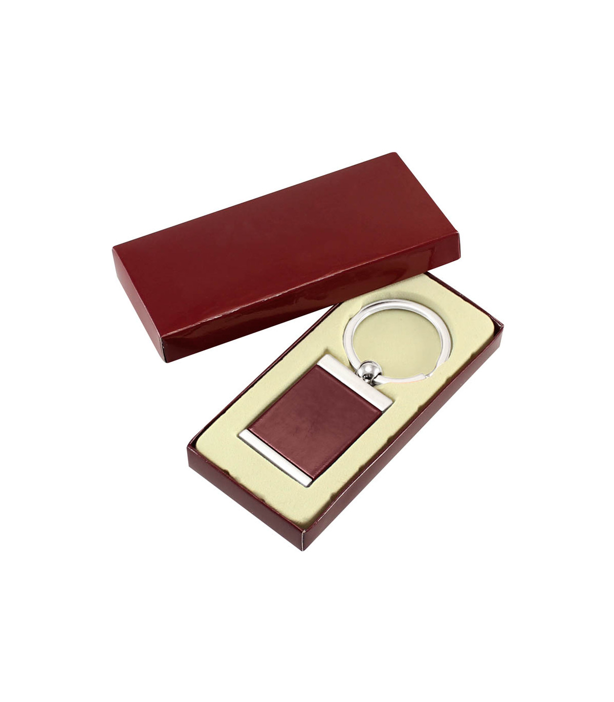 Llavero de simil Cuero Café + Mosquetón Metálico. Presentación en estuche laminado negro con cuna aterciopelada. • Tamaño Cuerpo: 4 x 4.8 x 0.4 cm.• Área Imprimible: 3 x 3.5 cm.• Factibilidad Logo: Serigrafía -...