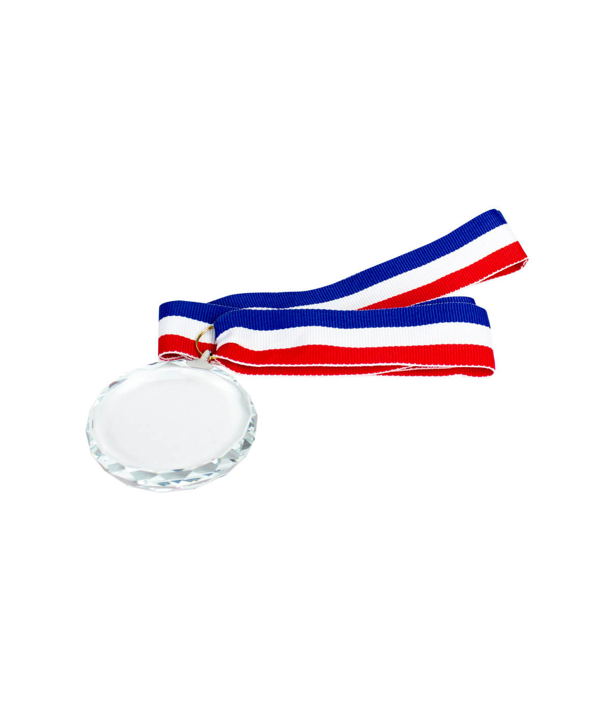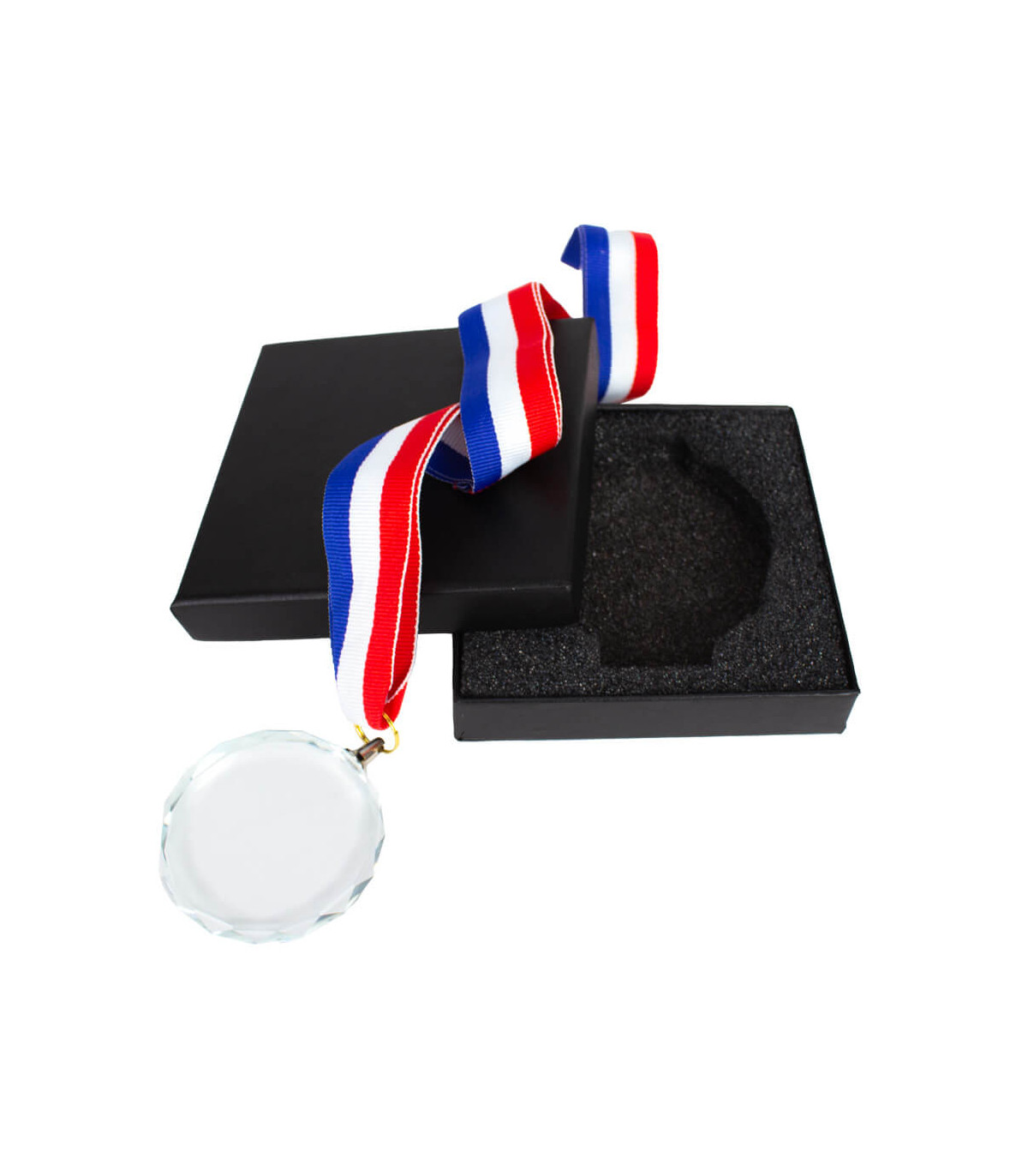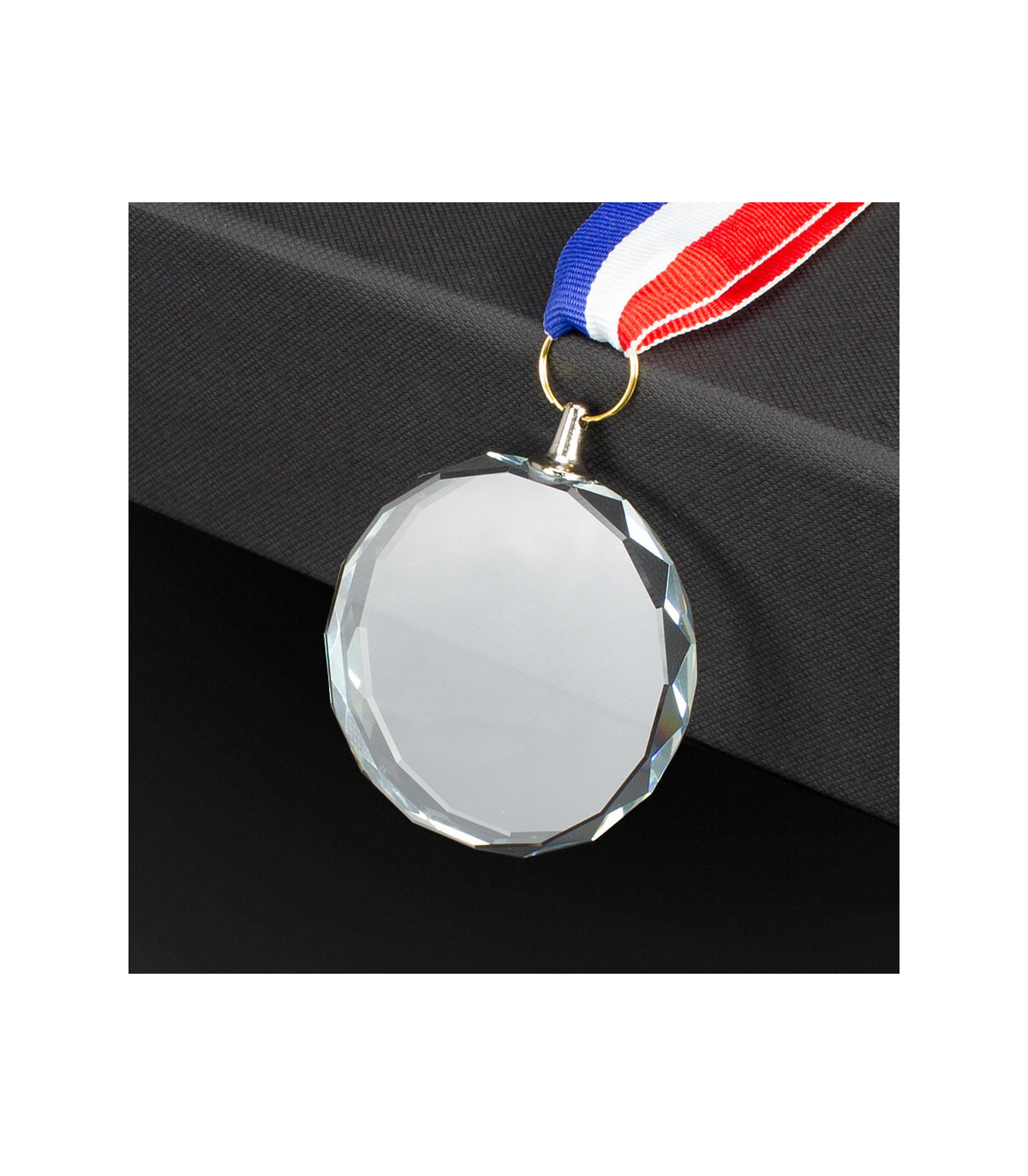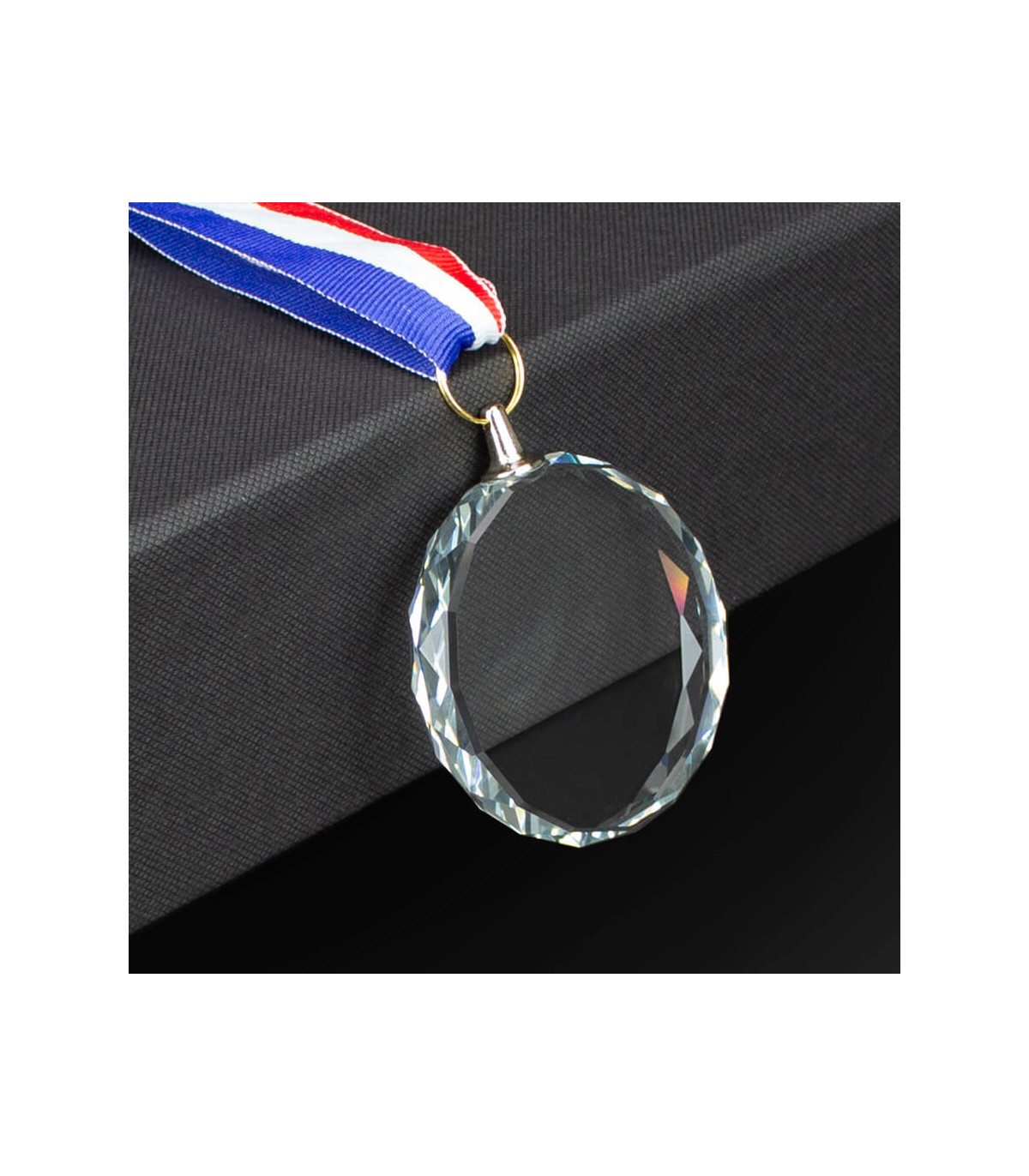 Medalla redonda de Cristal modelo «Diamond», con canto biselado. Incluye lanyard (cinta) colgante, de poliéster tricolor (azul-blanco-rojo), adosada a la medalla en su parte superior. Presentación en caja de cartón forrado negro, interior espuma negra troquelada.