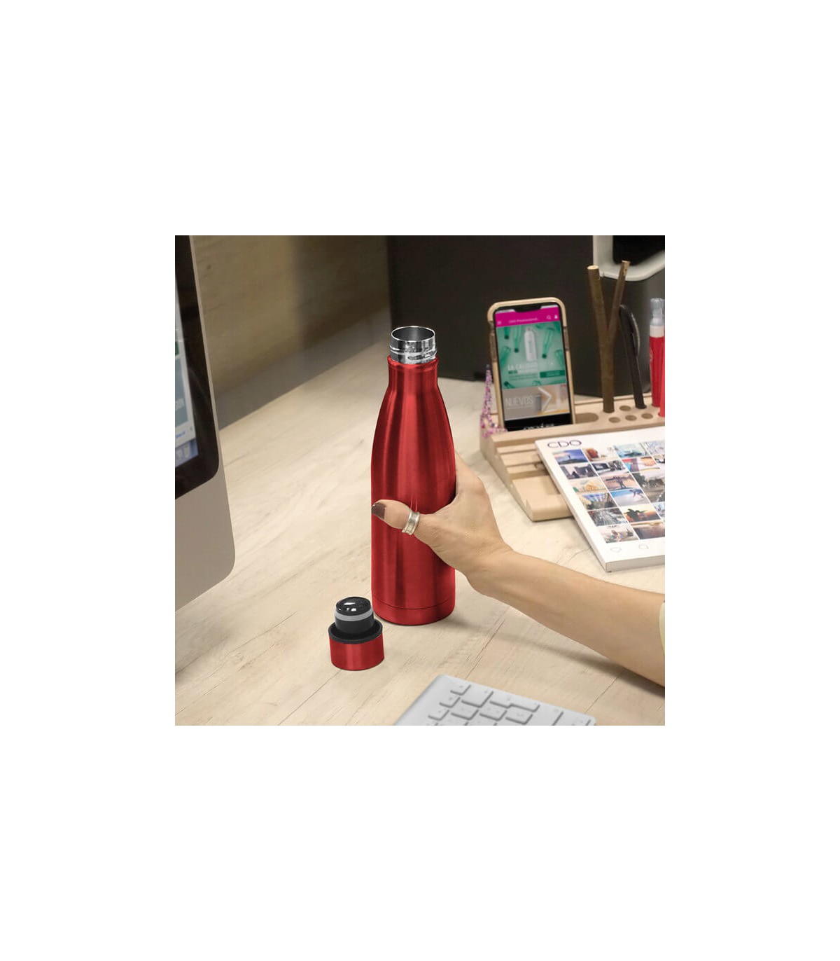 Ø 7cm x 25.5 cm. Capacidad 500 ml. Acero inoxidable. Botella doble pared, sellada al vacío. Interior de acero 304 y exterior de acero 201. Tapa plástica PP + Anillo de silicona antigoteo. Posee además tira de color...
