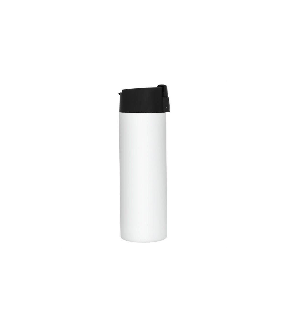 Ø 7 cm x 23 cm. Acero inoxidable. Capacidad 450 ml. Botella doble pared, sellada al vacío. Interior de acero 304 y exterior de acero 201. Pintura color blanco brillante apta para sublimado. Tapa en PP con traba de seguridad y botón pulsador de apertura. Mantiene por más de 12 hs la temperatura de las bebidas calientes y 24 hs de las bebidas frías. Presentación en caja de regalo kraft.