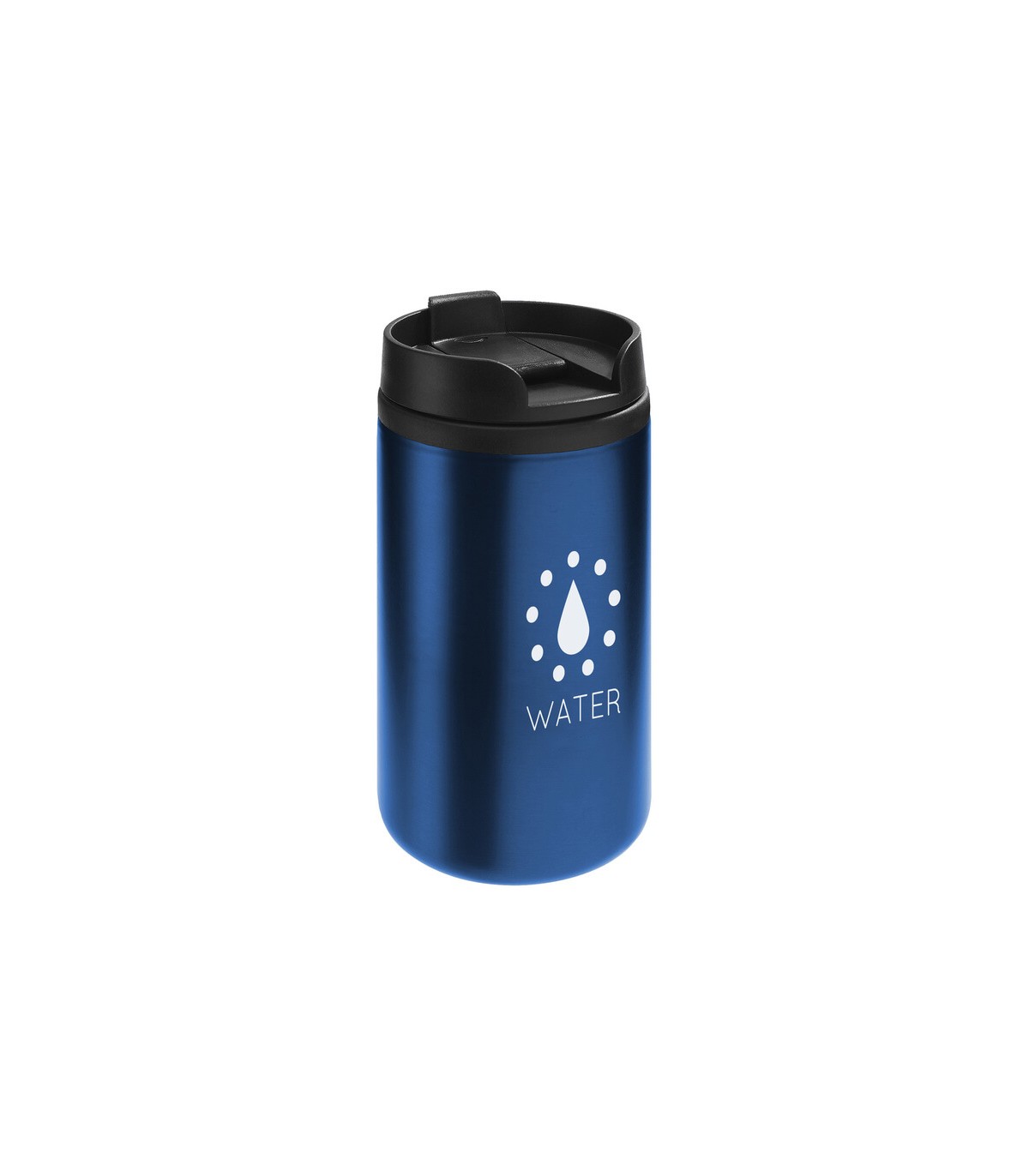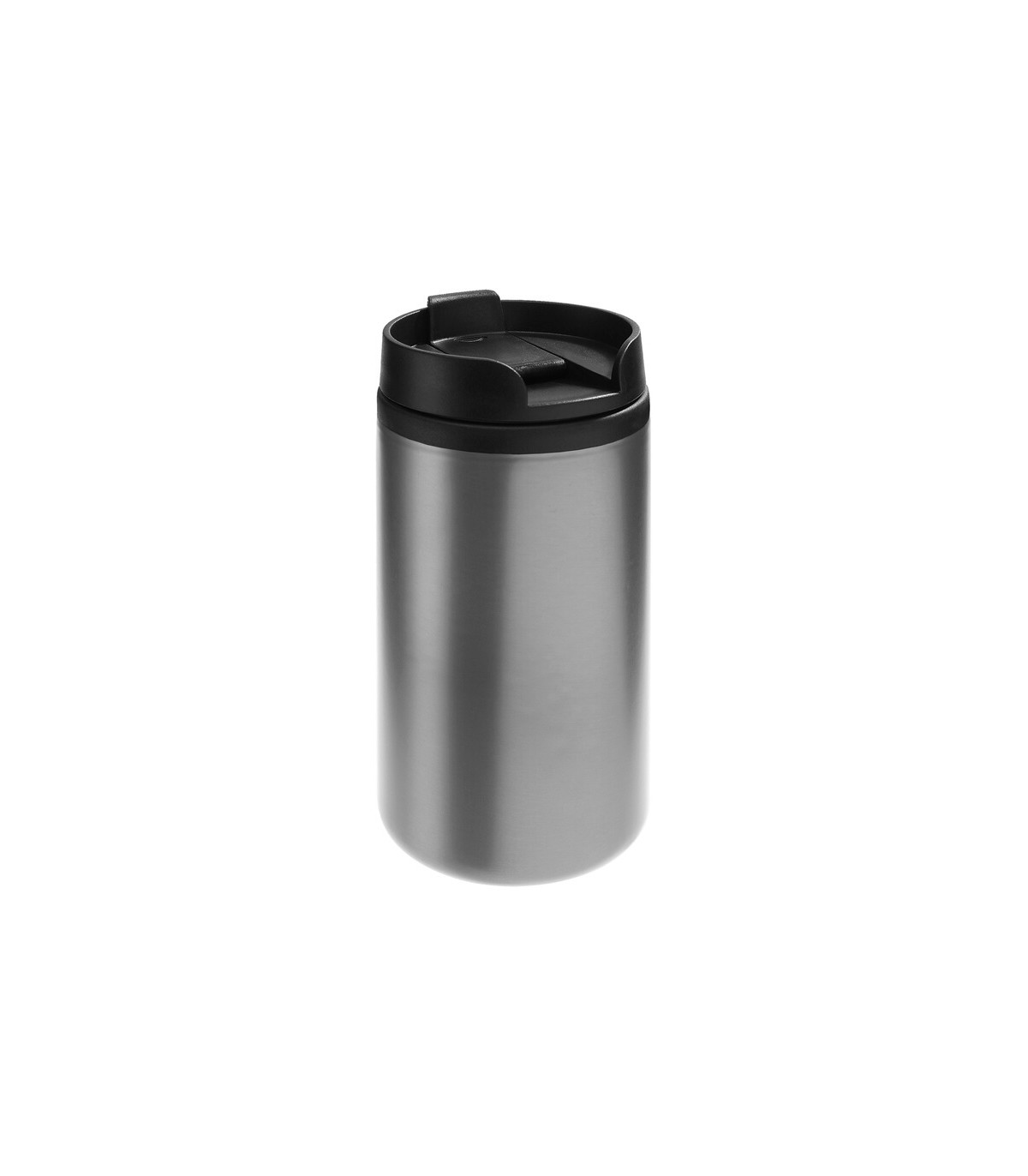 Ø 7 x 14 cm. Capacidad 290 ml. Acero inoxidable y plástico. Mug térmico doble pared, interior de plástico y exterior de acero inoxidable. Tapa a rosca plástica color negro con cierre a presión antiderrame. Base antideslizante. Presentación en caja de regalo.