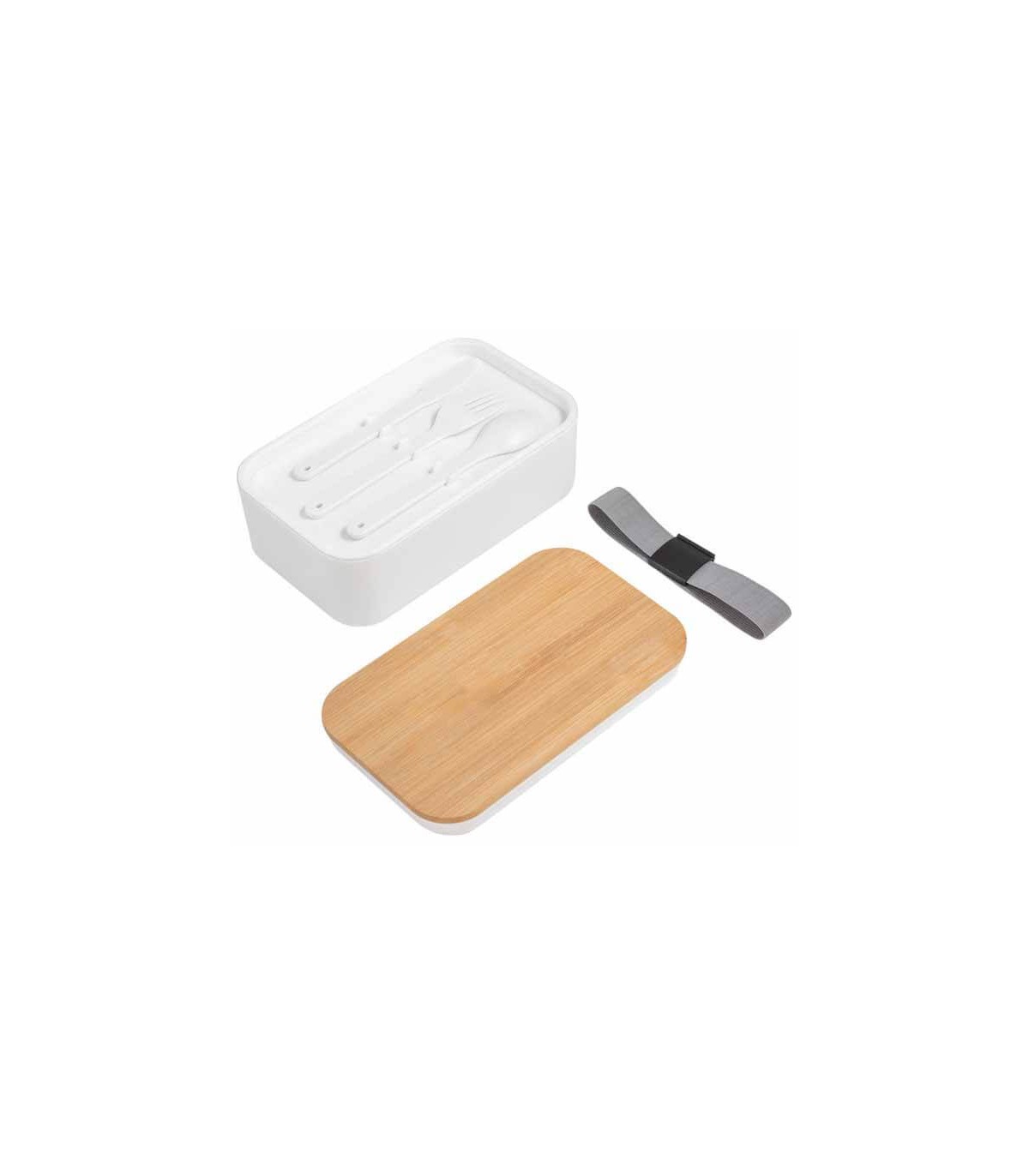 19,2 x 11,5 x 7 cm. Bambú + PP. Contenedor de alimentos con tapa de Bambú. Posee un compartimento plástico y bandeja porta set de 3 cubiertos (cuchillo, tenedor y cuchara). La tapa de bambú debe presionar firmemente la bandeja donde se fija el juego de cubiertos. Cierre con sujeción elástica color gris y hebilla plástica color negro. Producto apto para microondas (sin la tapa). Importante: solo se puede calentar la comida, NO sirve para cocinarla.